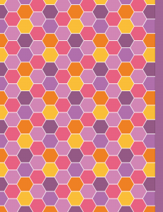 - Chemicals, molecules, and other fun science imagery decorate purple front cover, colorful hexagon pattern on back